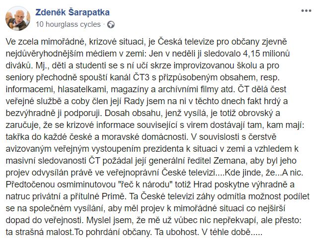 Velice podobně hovořil člen Rady ČT Zdeněk Šarapatka. Nejdříve vychvaloval ČT za její tvorbu a dosah a pak poznamenal: „Předtočenou osmiminutovou ‚řeč k národu‘ Hrad poskytne výhradně a natruc privátní a přítulné Primě. Ta České televizi záhy odmítla možnost podílet se na společném vysílání, aby měl projev k mimořádné situaci co nejširší dopad do veřejnosti. Myslel jsem, že mě už vůbec nic nepřekvapí, ale přesto: ta strašná malost. To pohrdání občany. Ta ubohost. V téhle době...“