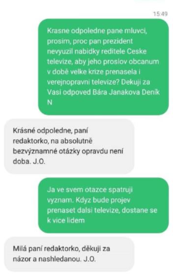 Proč bude projev exkluzivní pro TV Prima, chtěla vědět Barbora Janáková z Deníku N. Z její komunikace se Zemanovým mluvčím unikl tento záznam. „Paní redaktorko, na absolutně bezvýznamné otázky opravdu není doba,“ odpověděl Janákové mluvčí. Dotyčná se chtěla přít dále, nicméně Ovčáček konverzaci ukončil s poděkováním za názor.